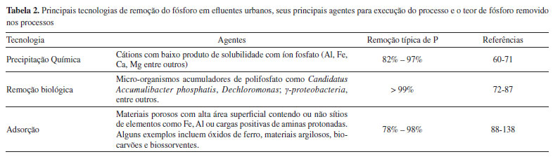 CONCLUSÕES Frente à situação em que as principais bacias hidrográficas do estado de São Paulo se encontram, conclui-se que é necessária imediata ação para prevenir uma crise hídrica, que se mostra iminente, pelo comprometimento das águas de abastecimento em relação à sua qualidade, em especial, devido à eutrofização. A implementação, nas ETEs, de tratamentos direcionados à remoção do fósforo deve considerar, ainda, a possibilidade de reuso do nutriente na agricultura. Esse avanço se mostra adequado e essencial à manutenção da segurança hídrica e alimentar, visto que o P é um nutriente não renovável e insubstituível à nutrição de diferentes formas de vida. O desenvolvimento de tecnologias que visam minimizar as problemáticas que envolvem o fósforo, consideram o controle da eutrofização já observada em diversos corpos d'água, bem como a recuperação do elemento de meios em que há seu excesso para os de sua escassez. Fazem parte desses processos a precipitação química, a remoção biológica e os métodos de adsorção, em particular aqueles que utilizam bentonitas modificadas com metais. Esses adsorventes demonstram potencial no tratamento e recuperação do fósforo, por seu desempenho em baixas concentrações de fósforo, baixo custo envolvido no processo, ausência de riscos ambientais desde que promovida a adequada escolha do metal utilizado e potencial de recuperação do adsorvato como um fertilizante, estabelecendo um processo de incremento à segurança hídrica e alimentar. A expansão e aperfeiçoamento de tais processos é altamente recomendável, especialmente para as Estações de Tratamento de Esgoto de São Paulo, que necessitam de estratégias de alta eficácia e fácil aplicabilidade, com retorno do nutriente para o meio agrícola pela reversibilidade da adsorção.