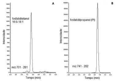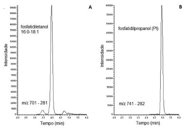 ![]() Figura 2. Amostra calibradora no limite inferior de quantificação. 2A: PEth 10 ng mL-1, 2B: Padrão interno