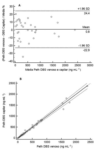 Levando em consideração a simplicidade de preparo das amostras com extração de mancha com 8 mm contendo aproximadamente 18 µL de sangue, permitiu uma alta recuperação mesmo dentro de diferentes concentrações de Hct, com uma média de 70%, não divergindo significantemente da recuperação avaliada em Hct 40% (Tabela 2). A SWGTOX não indica valores críticos para o rendimento da extração, contudo, é importante avaliar se o rendimento é proporcional em todos os níveis da curva. Ainda, esse parâmetro está diretamente relacionado à especificidade e sensibilidade do método. No presente estudo, o rendimento foi próximo em todos os níveis avaliados, sem impacto significativo do Hct, possibilitando analises com alta sensibilidade e sem efeito matriz importante. Aplicação do método Comparabilidade entre DBS capilar e DBS venoso Os resultados obtidos na análise de PEth em DBS capilar entre as 41 amostras variaram de 14,50 a 2.380,80 ng mL-1 (mediana 326,55 ng mL-1). Para os resultados da análise de DBS venoso, a variação foi de 17,00 a 2.389,70 ng mL-1 (mediana 288,50 ng mL-1). As concentrações de DBS entre sangue capilar e venoso tiveram alta correlação, com r=0,924 (p >0,001). Em regressão Passing-Bablok não foram identificados erros constantes entre as medidas obtidas em DBS capilar e DBS venoso, com intervalo de confiança (IC) de 95% do intercepto de -15,290 a 7,768 ou erros proporcionais, IC 95% da inclinação entre 0,9515 e 1,0477 (Figura 3). A comparabilidade da matriz também foi avaliada via Bland-Altman, com média das diferenças entre as medidas em DBS capilar e DBS venoso próxima a zero, de 0,8 ng mL-1 com IC 95% -3,46 a 4,97. Além disso, as diferenças foram distribuídas em ambos os lados da média, indicando que não existem erros sistemáticos. Apenas um resultado ficou fora da faixa dos dois desvios ao redor da média, demonstrando a comparabilidade entre sangue capilar e DBS de sangue venoso e a viabilidade no uso de sangue capilar para a determinação de PEth em aplicações clínicas.