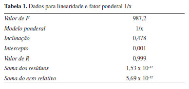 A técnica utilizada para o preparo das amostras foi relativamente simples, com extração líquida com metanol e acetonitrila, seguida de evaporação da fase orgânica, com recuperação média do PEth ~70%. O acetato de amônio adicionado na ressuspensão do extrato permitiu uma ionização mais eficiente dos analitos com maior sensibilidade no ensaio. Validação do método O método foi linear no intervalo de 10 a 3000 ng mL-1. Todas as curvas de calibrações incluíram este amplo intervalo, devido a grande diferença nas concentrações encontradas entre as coletas realizadas neste estudo. Os dados da curva de calibração, apresentado na Tabela 1, possuem heterocedasticidade significativa, com Fexp = 987,2. Diferentes fatores ponderais foram avaliados para a seleção modelo de regressão a ser empregado. Dentre os modelos avaliados, a regressão utilizando o fator ponderal 1/x apresentou menor Σ Resíduos e coeficiente de correlação de 0,9988.