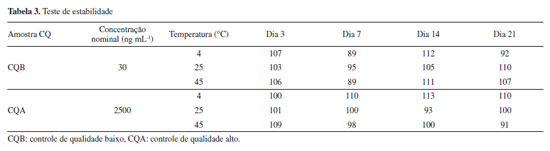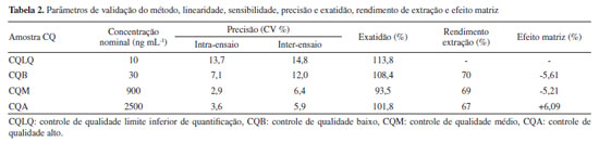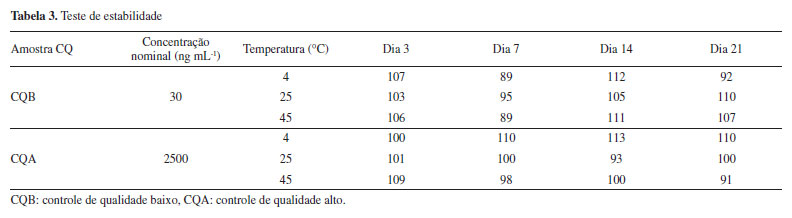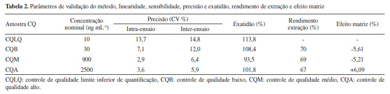 Os resultados de precisão e exatidão foram adequados, conforme a Tabela 2. A precisão intra-ensaio apresentou CV de 2,9 a 13,7% e a precisão inter-ensaio CV entre 5,9 e 14,8%, demonstrando adequada repetibilidade do método. A exatidão foi estimada entre 93,5 a 113,8%, também dentro dos critérios de aceitação para métodos bioanalíticos preconizados pelo Scientific Working Group for Forensic Toxicology (SWGTOX).19