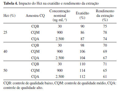 A maioria dos estudos de estabilidade, abrangem a avaliação da amostra em temperatura ambiente e refrigerada, não abordando temperaturas mais altas.22,23 Levando em consideração as temperaturas registradas em países tropicais como o Brasil, é de suma importância avaliar também em temperaturas mais altas. A técnica de DBS, somado a estabilidade do analito em temperatura ambiente, bem como em variações até 45 ºC, viabiliza o transporte postal globalizado, visando também a segurança devido à inativação de patógenos no papel filtro. O que favorece também a coleta em locais remotos, bem como no ambiente de trabalho e centros de reabilitação.12,13 A utilização de coleta capilar para microamostragem seca em substituição da tradicional punção venosa vem se mostrando um diferencial para evitar a formação in vitro como também a degradação pré-analítica. É sabido que em sangue fresco o PEth não apresenta estabilidade adequadas para o armazenamento, exceto a -80 ºC, devido a ocorrência de falsos positivos em amostras que contenham etanol.17,24 Também a presença de fosfatidilcolina fosfolipase C (PLC) em eritrócitos está relacionada com a degradação de PEth.17,25 Kummer et al.24 confirmou a estabilidade do analito em sangue fresco quando armazenado a -80 ºC por até seis meses, bem como em DBS quando armazenadas em temperatura ambiente pelo mesmo período. Ressaltando a simplicidade referida pela técnica de DBS, não fazendo necessário a aquisição de um freezer de ultrabaixa temperatura para a obtenção dos mesmos resultados. Sendo assim, a utilização da punção capilar diretamente no papel filtro é a técnica ideal para mensurar níveis de PEth, pois mimetiza os riscos de complicações in vitro pré analíticas,17,24,25 considerando o tempo e a demanda necessários para aplicação do sangue venoso em DBS, sendo a janela de tempo entre a coleta e o transporte até o laboratório o suficiente para obtenção de resultados duvidosos.17 A escolha da utilização do papel filtro Whatman 903® foi um diferencial para a estabilidade desse estudo. Beck et al. avaliaram a aplicabilidade de três dispositivos volumétricos de microamostragem de sangue seco (DBS), por também ser um fator a considerar no momento de precisar concentrações. Foi observada a formação in vitro pré-analítica em todos dispositivos, embora em graus variados, após a secagem e armazenamento em temperatura ambiente. Acredita-se que a causa provável para esse fenômeno seria o tempo de secagem e a evaporação do etanol, sendo muito mais lento nos dispositivos quando comparado com o papel filtro que ocorre abertamente.17 A Tabela 4 apresenta os resultados do impacto do Hct na exatidão e no rendimento da extração. Embora nossos resultados indiquem uma tendência de maiores recuperações em menor Hct, isso não pareceu impactar significativamente na exatidão do método, pois todos os dados estavam dentro da faixa aceitável de 85-115%. À medida que a viscosidade do sangue aumenta com o Hct, menores volumes de sangue são obtidos no disco de 8 mm em níveis baixos de Hct, isso provavelmente compensou o impacto de maiores recuperações na exatidão para Hct 25%, enquanto o oposto para o Hct 50%.
