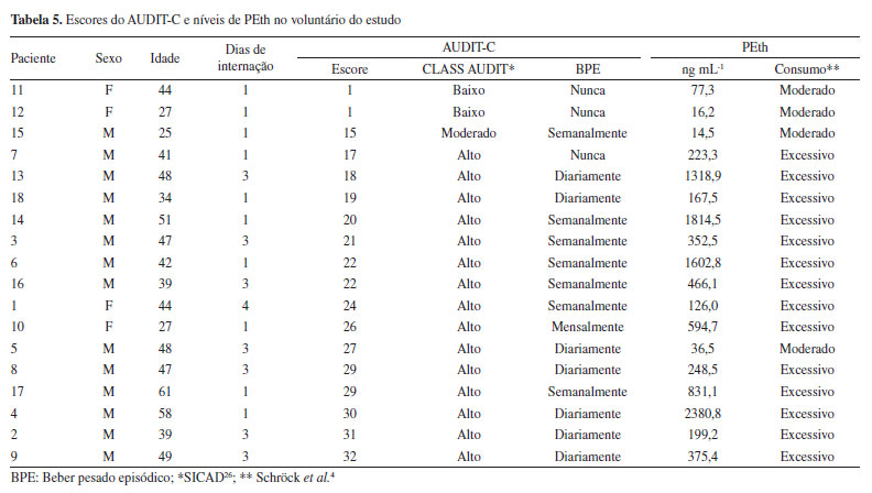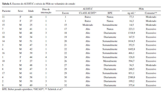 Avaliação do PEth com escore AUDIT em pacientes internados para reabilitação A maior parte dos pacientes eram do sexo masculino (84%), sendo 21 homens e 4 mulheres. A faixa etária variou de 20 a 61 anos, com média e desvio padrão de 41 ± 10 anos. As coletas das amostras e aplicação do teste AUDIT respeitaram o limite de até 4 dias de internação, com média de 1,9 ± 1,0 dias entre os pacientes. As informações dos voluntários do estudo estão apresentadas na Tabela 5.
