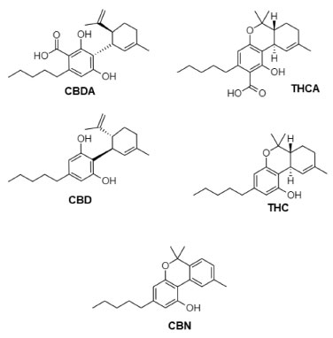 ![]() Figura 1. Estrutura química dos principais canabinoides no controle de qualidade de produtos derivados de Cannabis sativa para fins medicinais