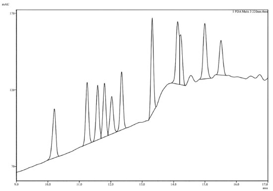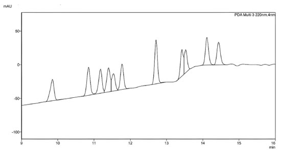 ![]() Figura 3. Picos cromatográficos na ordem de A - K, na concentração de 0,002 mg mL-1, vazão de 0,600 mL min-1, λ= 220 nm, volume de injeção de 20 μL e temperatura de forno de 37 ºC
