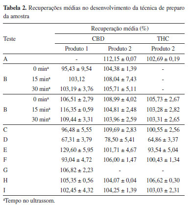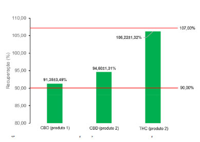 ![]() Figura 4. Resultados de recuperação de CBD e THC nos produtos 1 e 2