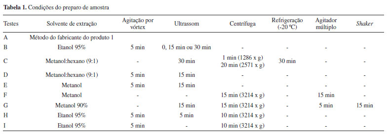 PARTE EXPERIMENTAL Padrões e reagentes A Substância Química de Referência (SQR) de CBD (98 102%) foi adquirida da BSPG Laboratories, a SQR de THC (0,995 mg mL-1) adquirida da Farmacopeia Americana, a SQR de Ácido Canabidiólico (CBDA) (1,00 mg mL-1) adquirida da Dr. Ehrenstorfer e a SQR de Canabinol (CBN) (1,00 mg mL-1) adquirida da Lipomed. Foram fornecidas seis soluções de SQR pelo fabricante do produto 2, utilizadas no desenvolvimento do método cromatográfico: Canabidivarina (CBDV), CBDA, Canabigerol (CBG), CBD, Canabitriol (CBO), tetra-hidrocanabivarina (THCV), CBN, Δ9 THC, Δ8-THC, canabicromeno (CBC) e THCA (0,002 mg mL1); CBG, CBN e CBC (0,002 mg mL-1); CBDA, THCV e THCA (0,002 mg mL1); CBDV e CBO (0,002 mg mL-1) e por fim, duas soluções com os canabinoides CBD (0,1012 mg mL-1) e THC (0,0952 mg mL-1) separadamente. Reagentes acetonitrila, metanol, n-hexano e etanol foram adquiridos da Merck. A água ultra purificada foi obtida por sistema de purificação de água, fabricante Milipore, modelo Milli-Q Integral 10. Instrumentação O desenvolvimento do método foi feito pela técnica de Cromatografia Líquida de Alta Eficiência com Detector de Arranjo de Diodos (CLAE-DAD) em equipamento de módulo único Nexera-i LC2040c 3D Plus da Shimadzu. Utilizou-se coluna cromatográfica com octadecilsilano (C18), (150 x 4,6 mm, 5 μm), fabricada pela ACE. Como amostra utilizou-se uma solução de SQR contendo 11 canabinoides, inclusive CBD, THC, CBDA e CBN, que são os de interesse do trabalho. A Fase Móvel (FM) foi composta de 0,1% (v/v) de ácido fórmico (FOA) em água (A) e 0,1% (v/v) de FOA em acetonitrila (B), com vazão de 0,600 mL min-1, temperatura do forno à 25 ºC e detecção no comprimento de onda ( λ) de 220 nm. A eluição ocorreu nas seguintes condições: 0 10 min de 50 a 95% de A, 10 16 min 95% de A; 16 17 min, retornou-se para as condições iniciais, que foram mantidas até os 18 min. Amostras As amostras dos produtos à base de Cannabis foram adquiridos por meio do programa de monitoramento pós-mercado de produtos da Cannabis e medicamentos contendo CBD/THC da Anvisa. Na etapa de desenvolvimento do preparo de amostra e na avaliação dos parâmetros do método foram utilizados quatro lotes de produtos, de dois fabricantes, ambos formulados em solução oral. Contendo como princípio ativo no Produto 1 somente CBD (200 mg mL-1) e no Produto 2, CBD (25 mg mL-1) e THC (27 mg mL-1). Posteriormente, o método foi testado em mais dois produtos, do mesmo fabricante do Produto 1 e igual formulação, alterando-se apenas suas respectivas concentrações de CBD. Sendo assim para o Produto 3 CBD (20 mg mL-1) e Produto 4 CBD (50 mg mL-1). Preparo da amostra As amostras foram submetidas por diferentes intervalos de tempo à agitação por vórtex, movimento reciprocante (shaker), ou ultrassom, além de refrigeração e centrifugação para separação do veículo oleoso. Como solventes de extração foram testados metanol, metanol: água (9:1), metanol:n-hexano (9:1) e etanol:água (95:5), totalizando nove diferentes condições de preparo da amostra, apresentados na Tabela 1. Dessas condições, A, B e C foram realizadas de acordo com as literaturas disponíveis,11,12 enquanto D, E, F, G, H e I foram desenvolvidas. Cada teste foi realizado com mínimo de duas replicatas.