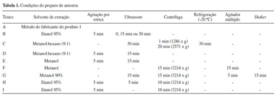 O teste A corresponde às condições do método analítico do fabricante do produto 1. O resultado do produto 2 nesse método foi satisfatório para análise de THC e insatisfatório para CBD, com valor superior ao estabelecido como critério de aceitação. No entanto, foi observada baixa variação de resposta entre as replicatas dos analitos. As condições de análise do método do fabricante do produto 2 não puderam ser aplicadas ao produto 1, pois o solvente de extração não permitiu a solubilização da sua matriz oleosa. Os testes B e C correspondem a métodos descritos na literatura aplicados a produtos de interesse medicinal. O teste B foi o proposto no trabalho de Ciolino e colaboradores,11 em que a amostra é transferida para um frasco contendo etanol 95%, misturada em vórtex para dispersar ou dissolver a matriz, e sonicada por 30 min caso a matriz não tenha sido dissolvida. Observou-se que em 5 min de agitação em vórtex foi obtida uma dispersão eficaz das amostras no solvente de extração, portanto, essa condição foi mantida para avaliação do método descrito neste artigo. Além da reprodução do método, avaliou-se a influência no tempo de ultrassom (0, 15 e 30 min) para a recuperação dos analitos. Esse teste foi realizado em duas ocasiões, na primeira avaliou-se apenas a recuperação de CBD e na segunda foram avaliadas as recuperações dos dois analitos. A influência do tempo no ultrassom mostrou ser mais importante para o produto 1, formulado em óleo. Para as replicatas que não passaram pelo ultrassom foi observado uma recuperação menor, em relação às que permaneceram por 15 e 30 min. O teste C foi proposto no trabalho de Carvalho e colaboradores.12 Pelos resultados obtidos, o método foi mais adequado para o produto 2 do que para o 1, no qual o DPR foi maior do que 5%, entretanto, o valor de recuperação para CBD no produto 2 encontra-se acima de 107%. Valores de recuperação próximos a 100% foram obtidos para os dois produtos na reprodução dos métodos da literatura. Porém, esse último método emprega um longo processo de extração (aproximadamente 80 min), portanto, foi proposto um teste em que fosse utilizado o solvente de extração usado por Carvalho e colaboradores12 no procedimento descrito por Ciolino e colaboradores11 (Teste D). A proposta de alteração no método mostrou-se insatisfatória, pois as recuperações foram inferiores ao necessário para ambas as amostras. O mesmo procedimento também foi testado alterando-se o solvente de extração para metanol (Teste E). Os resultados de recuperações médias foram próximos a 100%, entretanto, os coeficientes de variação ficaram próximos ao limite aceitável (5,00%). Alterações nas condições analíticas do método do fabricante do produto 1 também foram propostas. Como a desvantagem observada no método original foi a realização de diversas etapas, que consomem mais de 60 min para execução, foi testada a adaptação do método condensando todas as etapas em apenas uma (Teste F). O resultado do teste foi satisfatório para os dois produtos, porém, o valor de DPR para o produto 1 foi próximo ao limite de 5,00%. No teste G, propôs-se um novo procedimento, com mais etapas de processo de extração da amostra, além da adição de uma etapa de centrifugação para redução de interferentes da matriz. Como o produto 1 foi o que apresentou desempenho inferior nos métodos testados anteriormente, apenas ele foi utilizado como amostra. Obteve-se valor de recuperação de CBD dentro do critério de aceitação. Apesar dos bons resultados já obtidos, testou-se mais uma condição, com menor tempo de execução. As amostras foram transferidas para um tubo de polipropileno, adicionou-se etanol 95%, agitou-se por inversão e depois em vórtex por 5 min, metade das replicatas ficaram por 5 min no ultrassom (Teste H) e a outra metade seguiu direto para a etapa seguinte (Teste I), em que foram centrifugadas a 3214 × g durante 10 min. Por fim, diluiu-se o sobrenadante à CT e filtrou-se a solução em membrana PTFE 0,22 μm para vial. O peso dessas alíquotas foi registrado e posteriormente os valores de recuperação foram corrigidos de acordo com a densidade. Os resultados de ambos os testes foram satisfatórios. Nos testes B, D e E foram realizados os mesmos procedimentos de extração e centrifugação das amostras, variando apenas os solventes de extração, etanol 95%, metanol:n-hexano (9:1) e metanol, respectivamente. Observou-se que a extração com etanol:água (95:5) foi a mais eficiente, assim como observado na literatura.11,16 Esse resultado se deve à alta afinidade do etanol pela estrutura molecular dos canabinoides.17 Por fim, durante os testes para o desenvolvimento do método, foi possível notar que por se tratar de amostras com maior viscosidade, a aliquotagem em uma micropipeta mecânica de deslocamento de ar não foi eficaz, pois a solução não consegue ser totalmente escoada da ponteira, o que pode ocasionar erros. Esse problema pode ser solucionado com a utilização de pipeta e ponteira de deslocamento positivo ou, pela amostragem por medida gravimétrica, caso a densidade do produto seja conhecida. Dentre os testes realizados, o Teste H foi o que apresentou resultados de recuperação dentro dos limites estabelecidos, com baixo DPR e menor tempo de execução, além de ter sido um dos testes em que o volume das alíquotas foram também pesadas. Portanto, dentre os métodos testados, este foi o selecionado. Método cromatográfico A coluna cromatográfica com C18 foi a mais utilizada nos métodos descritos na literatura, apesar de nesses métodos serem utilizadas majoritariamente colunas com tamanhos de partículas inferiores a 3 μm, que auxilia a eficiência de separação dos analitos, no presente trabalho utilizou-se uma com 5 μm por ser a coluna mais encontrada na maioria dos laboratórios de cromatografia.17-19 As soluções de FM para o si