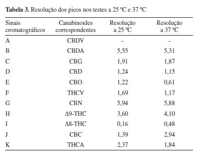 A correspondência entre os sinais cromatográficos e cada canabinoide, além dos valores de resolução encontram-se na Tabela 3. Apesar de não ter sido possível obter resolução suficiente para os 11 canabinoides, considerou-se que a resolução entre os canabinoides do objetivo do presente trabalho é atingida.
