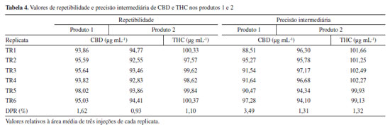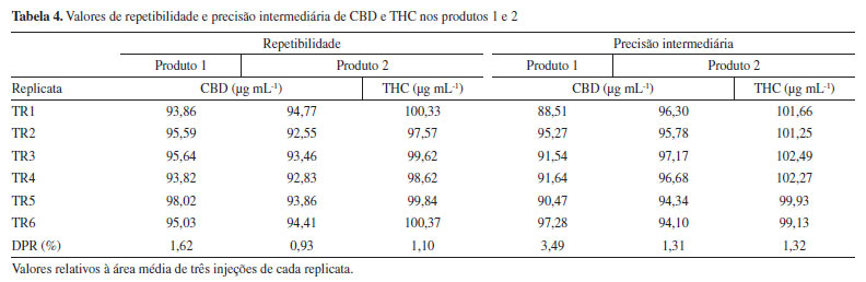 A temperatura mais elevada reduziu a resolução de 7 dos 11 sinais cromatográficos. Portanto, utilizando a condição com temperatura de 25 ºC, foram injetadas as soluções SQR de CBD, THC, CBDA e CBN para comparação dos tempos de retenção, com o objetivo de identificar os picos correspondentes a esses canabinoides. Os outros sinais foram deduzidos pela ordem de eluição através da comparação com o método do produto 2, que possui FM com composição semelhante a testada e pela comparação dos cromatogramas obtidos após injeção das três soluções contendo: CBG, CBN e CBC; CBDA, THCV e THCA; CBDV e CBO. Esse recurso foi utilizado, uma vez que os padrões desses canabinoides não estavam disponíveis de forma isolada. Os sinais que apresentaram resolução inferior à necessária para quantificação no teste foram CBD - CBG, CBO - CBD e Δ8-THC - Δ9-THC. As duplas CBD - CBG e Δ8-THC - Δ9-THC não apresentaram resolução de linha de base em nenhuma das condições testadas. A dificuldade na separação entre CBG e CBD também foi relatada na literatura.24,25 Para resolver esses picos, Fekete e colaboradores24 utilizaram temperatura de 50 ºC e Krizman,25 37 ºC, ambos utilizando como FE octadecilsilano, entretanto, também utilizaram soluções tampão como parte aquosa da FM. A resolução desses picos foi obtida por Citti e colaboradores20 pela alteração do modo de eluição, de isocrático para gradiente, e pela troca do comprimento da coluna cromatográfica, de 50 mm para 100 mm, ambas C18, com o mesmo diâmetro e tamanhos de partícula, 3,0 mm e 2,7 μm, respectivamente. Também foi utilizado por Nemeskalová e colaboradores26 como FE uma coluna C18 e modo de eluição em gradiente para tentar resolver os picos CBD, CBG, entretanto, não obtiveram sucesso e a separação foi considerada insuficiente para detecção apenas por ultravioleta (UV). No método do fabricante do produto 2, a dupla CBD - CBG, junto com CBG - CBDA e CBC - THCA são consideradas críticas para adequação do sistema. As resoluções que essas duplas obtiveram no método desenvolvido foram iguais ou superiores ao limite especificado pelo método do fabricante. Portanto, baseado no método desenvolvido, podem ser realizadas otimizações, a fim de conseguir melhor separação entre os onze picos presentes na solução. Quanto a detecção, foi selecionado o comprimento de onda de 220 nm, uma vez que foi o valor aproximado de comprimento de onda com absorção máxima para os picos na solução de SQR e nas soluções de amostra, tanto para os canabinoides ácidos quanto para os neutros. Esse comprimento de onda também foi utilizado nos métodos dos fabricantes 1 e 2. Assim como relatado na literatura, foi observado que os canabinoides ácidos também apresentaram picos de absorção entre 270 nm e 310 nm.17,18 Parâmetros de avaliação do método Precisão O resultado do ensaio de repetibilidade e precisão intermediária do método para CBD e THC nos produtos 1 e 2 estão apresentados na Tabela 4. Os valores calculados de DPR foram inferiores a 5,0%, tanto no ensaio de repetibilidade, quanto no de precisão intermediária, o que atesta a precisão do método.