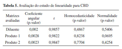 Linearidade Para o ensaio de linearidade para CBD foram preparadas 3 curvas, no diluente e uma curva de adição padrão em cada produto testado, com cinco concentrações entre 0,050 mg mL-1 e 0,150 mg mL-1 correspondentes a faixa de 50% a 150% da CT, e os resultados da avaliação pelo Software Action Stat® estão apresentados na Tabela 5.