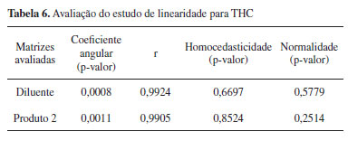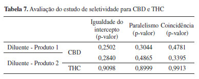 De acordo com os resultados, não foram rejeitados a significância do modelo linear pelo teste F da ANOVA, a hipótese de normalidade dos resíduos e a homocedasticidade da variância. Os valores dos coeficientes de correlação foram superiores a 0,990, portanto, a linearidade da curva na faixa de 0,050 mg mL-1 a 0,150 mg mL-1 foi confirmada. Seletividade Os resultados para o ensaio de seletividade para CBD e THC nos produtos 1 e 2 são apresentados na Tabela 7.