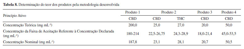 Na comparação entre as retas do diluente com os produtos 1 e 2 para o analito CBD e na comparação entre as retas do diluente com o produto 2 para THC, foi observado que elas possuem o mesmo intercepto, são paralelas e coincidentes. Portanto, foi possível constatar que o método é seletivo. Aplicação da metodologia em produtos à base de Cannabis A metodologia desenvolvida foi aplicada em quatro produtos de Cannabis obtendo-se os seguintes resultados, conforme apresentado na Tabela 8. O valor de recuperação média utilizada como critério de aceitação, de acordo com a CT, foi de 90% a 107%.15 Dessa forma, todos os resultados se mostraram satisfatórios dentro do critério estabelecido.