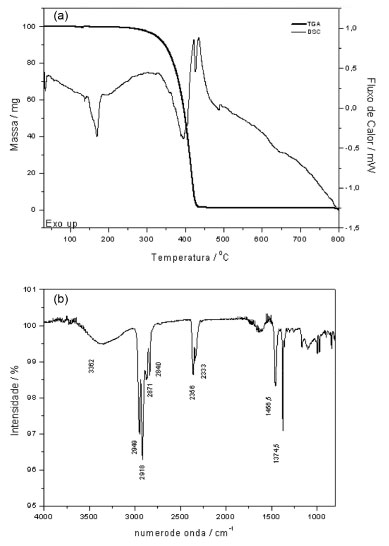 ![]() Figura 1. Análise da manta sintética não tecida: (a) TG - DSC 30-800 ºC com razão de 10 ºC min-1 em cadinho de α-Al2O3 alumina; (b) Espectroscopia na região do infravermelho 4000-800 cm-1 pelo método de refletância atenuada, com resolução de 4 cm-1