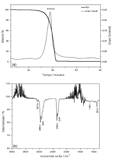 ![]() Figura 3. Análise dos gases liberados a partir da decomposição térmica da manta sintética não tecida: (a) TG / Gram-Schmidt; (b) Espectroscopia na região do infravermelho dos gases liberados da decomposição térmica da manta sintética não tecida ao tempo de 38,98 minutos de análise
