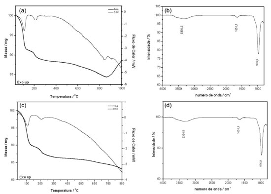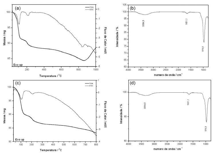 ![]() Figura 4. (a) Curva TG-DSC da vermiculita expandida bruta; (b) Espectro de absorção na região do infravermelho da vermiculita expandida bruta; (c) Curva TG-DSC da vermiculita expandida lavada com H2O; (d) Espectro de absorção na região do infravermelho da vermiculita expandida lavada com H2O