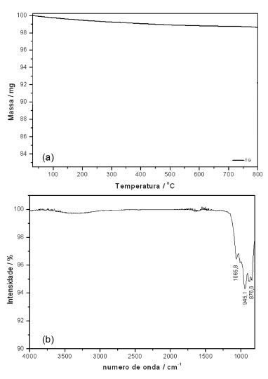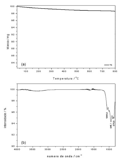 ![]() Figura 5. Análises da Vermiculita expandida após calcinação à 1000 ºC por 4 horas: (a) Curva TG; (b) Espectro de Absorção na região do infravermelho