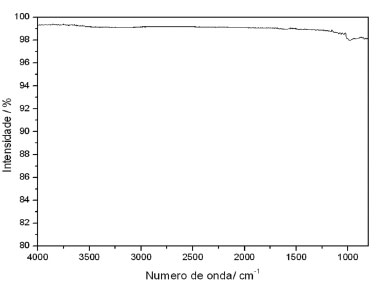 ![]() Figura 7. Espectro de Absorção na região do infravermelho representativo da amostra de resíduo metalúrgico (ferro). Foi utilizada a amostra menor que 75 micrometros sem qualquer tratamento prévio