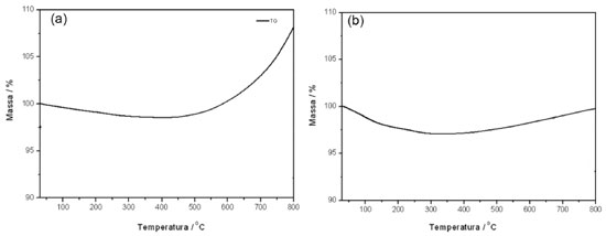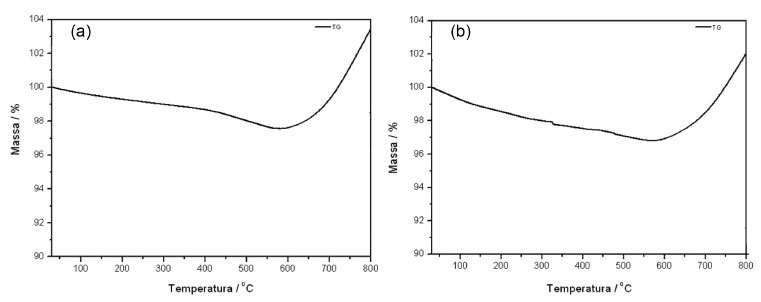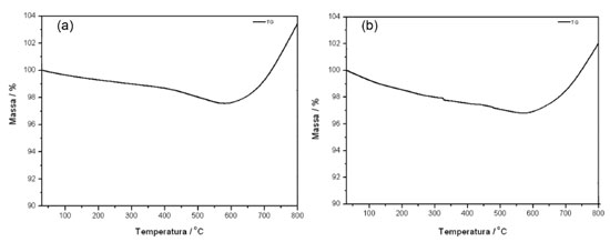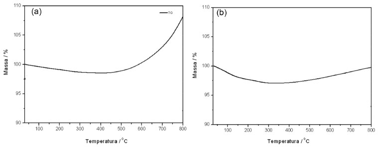 ![]() Figura 8. Curvas TG das amostras de resíduo metalúrgico (ferro) com granulometria menor que 500 micrometros, no intervalo de 30-800 ºC, razão de aquecimento de 10 ºC min-1 em cadinho de α-Al2O3 alumina: (a) Resíduo metalúrgico bruto; (b) Resíduo metalúrgico após tratamento com HCl