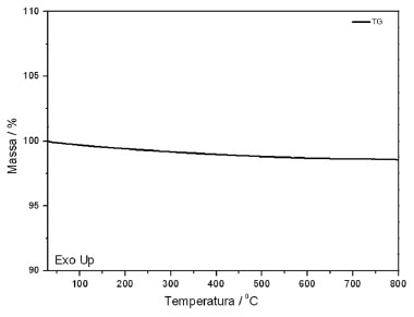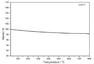 ![]() Figura 9. Curva TG da amostra de resíduo metalúrgico (ferro) com granulometria menor que 500 micrometros, após a calcinação à 1000 ºC por 4 horas