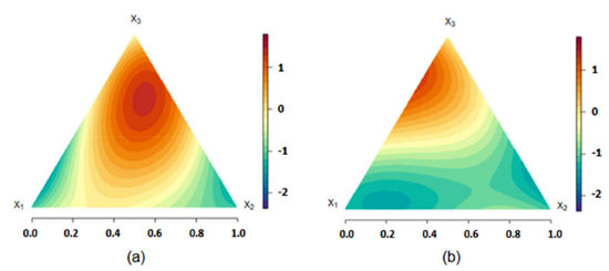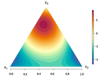 When analyzing the response surfaces shown in Figure 1, differences in the topology of the response surface of Scheffé's supersaturated (SS) model were observed for the sample pools without lipid supplementation Figure 1(a) and with lipid supplementation Figure 1(b). The surface corresponding to the serum samples without lipid supplementation shown in Figure 1(a) describes a well-defined maximum region within the evaluated experimental domain. The surface in Figure 1(b) describes a maximum region close to the limits of the studied experimental domain. This result is due to possible co-extractives in the matrix of the lipid supplement that the study animals received. To obtain a representative result for both sample pool types, the response surfaces shown in Figure 1 were measured. The mean Scheffé's SS model is shown in Figure 2.