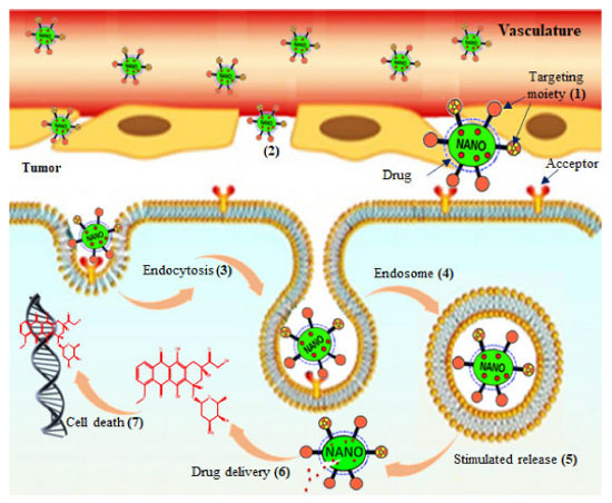 ![]() Figure 1. Illustration of the capture, internalization, and release of the drug in a tumor environment4 (adapted)