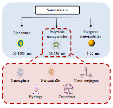 Nanocarriers can be prepared from lipids, proteins, and polymers, generating liposomes, inorganic NPs, and polymeric NPs (Figure 3), whose applications depend on their properties and synthesis methods.9,15