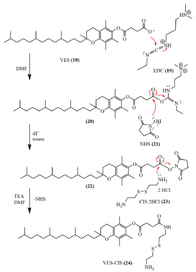 Then, as shown in Figure 8, the HA (25) is activated by EDC and it receives the VES-CYS (24) conjugate in one of the carbonyls bound to the CYS terminal nitrogen coupled to VES, which forms the HA-CYS-VES (HSV) conjugate (27).42