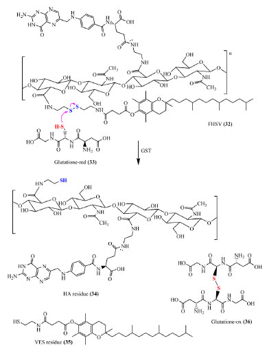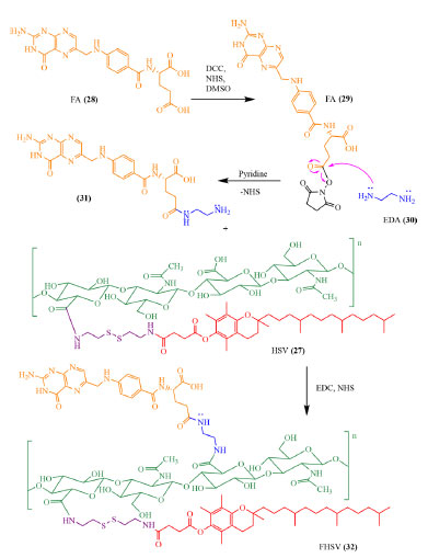 Additionally, as shown in Figure 9, the terminal carbonyl of FA (28) is activated with the aid of N,N'-dicyclohexylcarbodiimide, and the ethylene diamine nitrogen donates a pair of electrons to the carbonyl carbon, generating FA-NH2 (31), which reacts with the HSV conjugate (27) to form the amphiphilic polymer FA HA SS VES (FHSV) (32).42