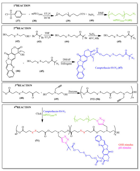 Multi-stimulated release The development of nanocarriers with disassembly triggered by more than one stimulus represents one of the most promising strategies in this field, as these nanocarriers allow for greater efficiency of therapy through both accelerated and prolonged delivery. Li et al.51 synthesized a novel prodrug nanocarrier based on a camptothecin derivative, PEG2000-N3, and PPD for the transport of doxorubicin with pH-responsive release and a high concentration of GSH.51 To prepare this nanocarrier, three synthetic precursors were obtained and synthesized separately: PEG2000-N3 (41), camptothecin derivative (47), and PPD (50). As shown in Figure 11, to synthesize the first precursor, two reactions are performed: tosyl chloride (OTS) (37) is reacted with PEG2000 (38) to produce PEG2000-OTS (39), which is reacted with sodium azide (40) in the second step to form PEG2000-N3 (41). Subsequently, in the second multistep reaction, the camptothecin derivative (47) containing a disulfide bond and an azide group is obtained. The third precursor is PPD (50), a polymer produced through a chemoenzymatic reaction, which was developed in 2018 by the same research group. Finally, in the fourth reaction, PEG2000-N3 (41) and the camptothecin derivative (47) were coupled to PPD (50) through a click reaction to produce the nanocarrier (51). PEG was added to provide a hydrophilic-hydrophobic balance to the system, which was positioned in the outer layer of the micelle.51