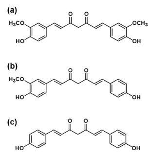 ![]() Figure 1. Structural formulas of curcuminoids. (a) Curcumin; (b) desmethoxycurcumin; (c) bisdemethoxycurcumin