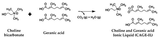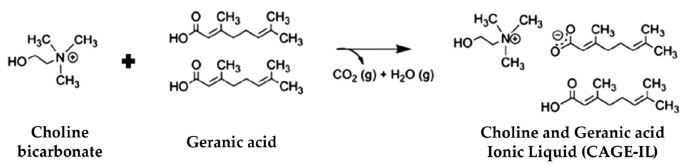 ![]() Figure 2. Schematic diagram: synthesis of choline and geranic acid ionic liquid (CAGE-IL), from the reaction between choline bicarbonate and geranic acid in a 1:2 molar ratio