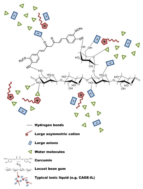 ![]() Figure 4. Putative mechanism of interactions between CAGE-IL, locust bean gum, curcumin and solvent species (dotted lines representing hydrogen bonding); (viz. water molecules). Adapted from Harada et al.56