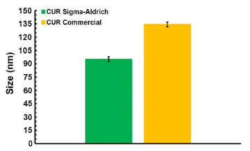 When preparing the nanoemulsion with pure curcumin (acquired from Sigma-Aldrich) and CAGE-IL, the average particle hydrodynamic size produced was 95.1 ± 2.8 nm with a PDI of 0.230 ± 0.008, whereas the use of commercial turmeric dissolved in CAGE-IL led to particles with average hydrodynamic size of 134.3 ± 2.6 and a PDI of 0.260 ± 0.005, as can be observed in Figure 5.