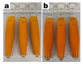 ![]() Figure 7. Images of formulated gels integrating nanostructured curcumin in CAGE-IL, subjected to centrifugation testing: (a) gel produced with commercial (turmeric) curcumin and CAGE-IL; (b) gel produced with pure (Sigma-Aldrich) curcumin and CAGE-IL