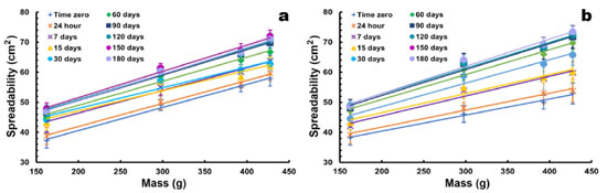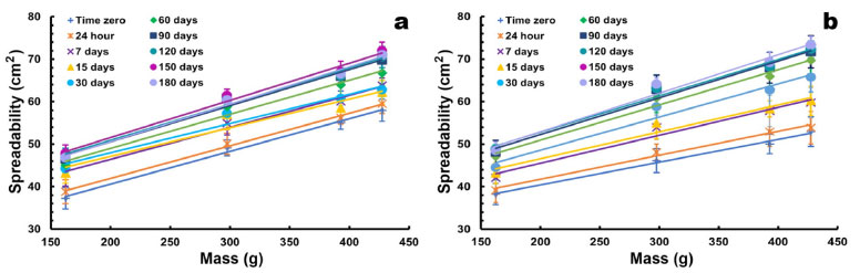 ![]() Figure 9. Spreadability values of the formulated gels as a function of the applied mass (g) (40 ± 2 °C; 75 ± 5% RH) (mean ± s, n=3): (a) commercial (turmeric) curcumin gel (2%, w/w); (b) pure (Sigma-Aldrich) curcumin gel (2%, w/w)