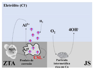 ![]() Figura 1. Esquema representativo mostrando as regiões catódicas e anódicas das diferentes regiões (JS/ZTA) da liga FSW AA2098-T351 em corrosão