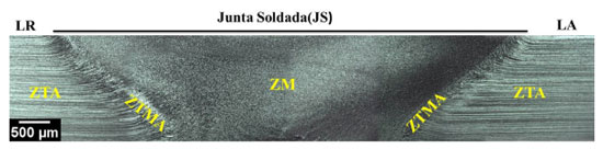 ![]() Figura 2. Micrografia óptica da seção transversal da liga AA2098-T351 soldada por FSW mostrando as zonas afetadas pela soldagem, no lado de retrocesso (LR) e no lado de avanço (LA)