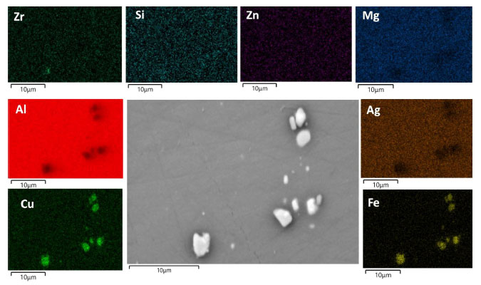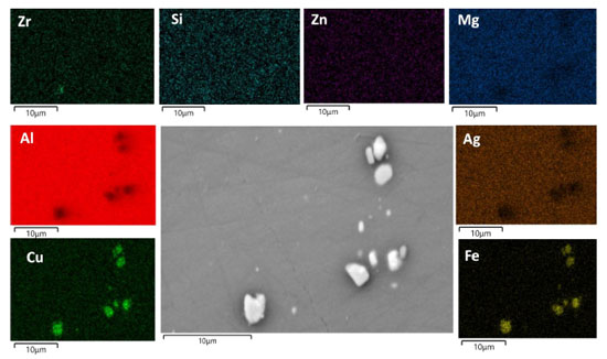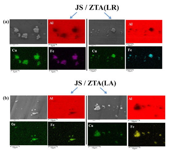 A Figura 2 mostra diferentes características microestruturais ao longo da soldagem como resultado do processo FSW. Os aspectos microestruturais foram discutidos em trabalhos anteriores e demostram que a variação dos parâmetros de soldagem utilizados modifica as propriedades mecânicas da liga AA2098-T351, o que está associado com a variação na densidade de fases endurecedoras nanométricas presentes neste material.34,37 De modo geral, são formadas diferentes zonas devido à deformação sofrida pelo material e aos diferentes ciclos térmicos que ocorrem durante o processo. Em ligas FSW soldadas, como a AA2098-T351, a zona de mistura (ZM) é caracterizada pela intensa deformação plástica e pelo forte aquecimento que causam recristalização dinâmica.37 Esta zona também apresenta dissolução de fases e formatos de grãos equiaxiais. Na zona termo-mecanicamente afetada (ZTMA), as altas temperaturas atingidas e o efeito do movimento da ferramenta provocam a deformação dos grãos.37 A dissolução das fases endurecedoras também ocorre nesta zona.37,38 Por outro lado, não são observadas modificações na forma do grão na zona afetada pelo calor (ZTA). No entanto, as temperaturas atingidas nesta zona são responsáveis pela dissolução e engrossamento das fases.37 Foi demonstrado que as temperaturas atingidas na junta de soldagem (ZTMA e ZM) de uma liga AA2098-T351 soldada por FSW foram maiores (300-600 °C) em comparação com a ZTA (< 380 °C). Na JS, as altas temperaturas atingidas causam a dissolução das partículas T1 (Al2CuLi) e a precipitação de partículas ricas em cobre como a fase Ω e as zonas GP.37 Estas são as fases predominantes em têmperas super envelhecidas de ligas Al-Cu-Li.39,40 A presença de partículas ricas em cobre nas diferentes zonas de soldagem das ligas Al-Cu-Li, bem como a dissolução da fase T1, tem sido relatada na litaratura.41,42 Imagens de MEV-EDS da liga estudada neste trabalho mostram que esta apresenta partículas micrométricas, Figura 3. Além dos mapas de EDS do metal base, mostrados na Figura 3, também foram obtidos mapas EDS das diferentes zonas da liga FSW, Figura 4(a) e 4(b). Os mapas elementares mostram que as partículas micrométricas são compostas principalmente por Al, Cu e Fe, em todos os casos (Figuras 3 e 4).