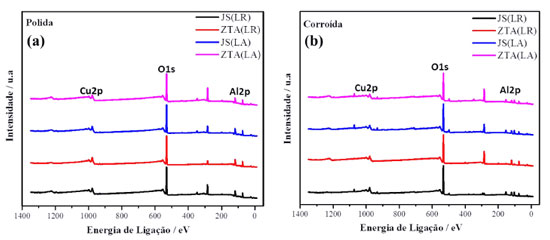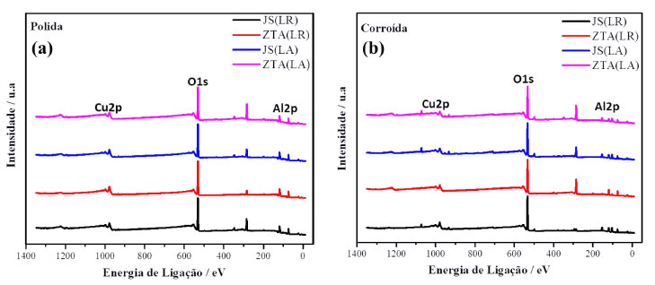 Caracterização química superficial da liga AA2098-T351 soldada por FSW A caracterização química superficial das zonas JS/ZTA(LR) e JS/ZTA(LA) da liga FSW AA2098-T351 polida e após processo de corrosão foi realizada utilizando a técnica XPS, tal como apresentado na Figura 5. Estas análises realizadas nas zonas da liga soldada permitiram comparar a composição química das diferentes regiões. A Figura 5 mostra os espectros XPS obtidos no modo linescan de ampla varredura registrados nas diferentes zonas de soldagem, tanto antes, quanto após processo de corrosão. Assim, a Figura 5(a) mostra os espectros registrados para a condição polida, enquanto a Figura 5(b) representa os espectros obtidos para estas zonas após corrosão (corroídas). Nas regiões analisadas da liga polida, elementos como O, Al e Cu foram observados.