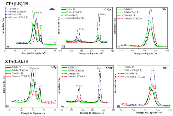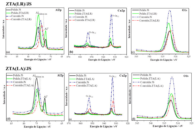 ![]() Figura 6. Espectros de XPS de alta resolução de Al2p, Cu2p e O1s obtidos nas zonas de acoplamento (a)-(c) JS/ZTA (LR) e (d)-(f) JS/ZTA (LA) da liga FSW AA2098-T35 polida e após processo de corrosão