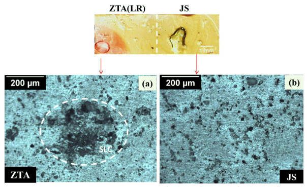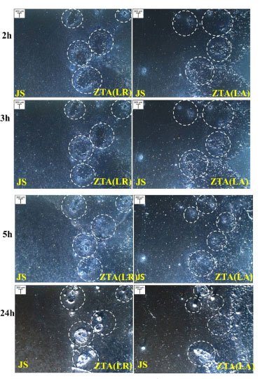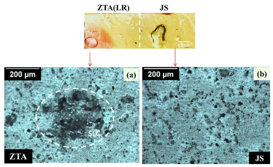 ![]() Figura 10. Imagens ópticas das zonas JS/ZTA do LR obtidas após o teste de visualização em gel ágar. O círculo branco pontilhado indica a região de CLS desenvolvida na ZTA