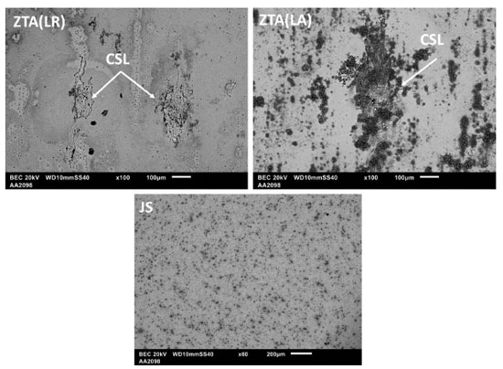 Essas observações devem estar relacionadas à maior diferença de potencial eletroquímico no LA. Portanto, a maior atividade de corrosão desenvolvida na ZTA (LA) em comparação a ZTA (LR), pode ser atribuída à maior quantidade de partículas quebradas e arrastadas nesse lado da liga soldada.9 As imagens de MEV apresentadas na Figura 8, confirmam esses resultados, mostrando que de fato no LA a intensidade da CLS é mais significativa comparada às outras zonas de soldagem da liga.