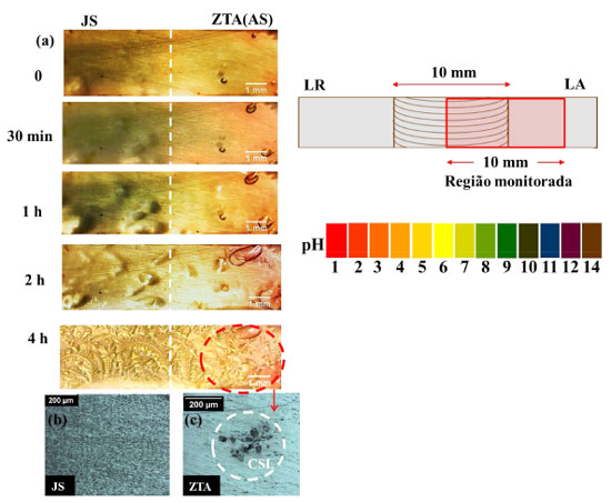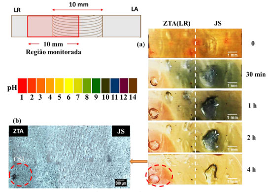 O desenvolvimento de processos de corrosão galvânica entre as zonas acopladas da liga soldada pode ser inicialmente visualizado usando o teste de ágar-ágar. Este simples teste pode ser aplicado para visualizar as regiões catódicas e anódicas em diferentes áreas das superfícies expostas ao gel de ágar-ágar a partir das mudanças de pH que ocorrem em sua superfície, pois estão diretamente associadas com a modificação da cor do gel, devido ao uso de um indicador universal de pH.28,50 Nesse teste, com o indicador utilizado, a cor verde está relacionada ao pH mais alto (alcalino), enquanto que as cores vermelho/laranja estão associadas ao pH mais baixo (ácido). As Figuras 9-11 correspondem às imagens de superfícies das zonas de soldagem acopladas JS/ZTA (LR) e JS/ZTA (LA) para diferentes tempos de exposição ao teste de ágar-ágar. Pode-se observar que quando a zona ZTA (tanto do LR quanto do LA) é acoplada ao JS, um aumento do pH, indicado pela escala de cor verde, ocorreu na superfície da JS. Portanto, reações catódicas estão predominando nesta zona. Por outro lado, houve diminuição localizada do pH nas regiões da ZTA, indicada pelas escalas de cor vermelha, que foi mais intensa nos sítios de corrosão localizada. Esses sítios estão associados à ocorrência de CLS, sendo observada uma forte atividade anódica nestes respectivos locais, quando acoplados ao JS, conforme mostrado nas Figuras 10(a) e 11(c). Finalmente, nenhum sítio de CLS foi observado nas zonas JS durante o teste (ver Figuras 10(b) e 11(b)).