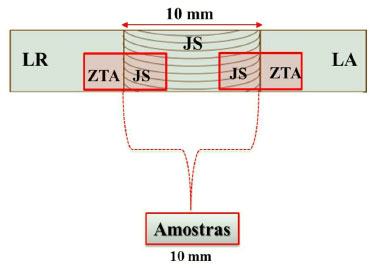![]() Figura 12. Esquema representativo da obtenção das amostras a partir das zonas JS/ZTA acopladas de ambos os lados (LA e LR) da liga AA2098-T351 soldada por FSW