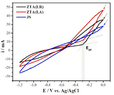 ![]() Figura 13. Voltamogramas cíclicos das regiões ZTA e JS da liga AA2098-T351 soldada por FSW obtidos por meio de uma microcélula eletroquímica