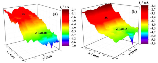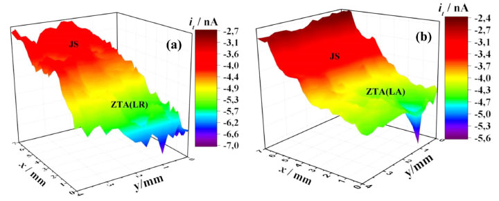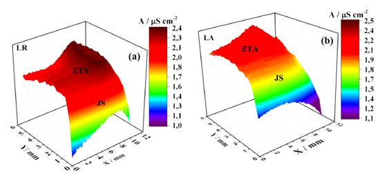 ![]() Figura 14. Mapas SECM das distribuições de correntes de redução de oxigênio obtidas nas regiões acopladas JS/ZTA do LR (a) e LA (b) da liga AA2098-T351soldada por FSW