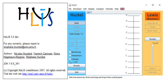 METHODS HuLiS software HuLiS37 is a software package for molecular electronic structure calculations based on the Hückel method. Figure 1 shows the HuLiS software interface. The input parameter used to solve the Hamiltonian system is the molecular drawing. This software allows for a change in the Coulomb integral of any atom (α) or resonance integral (β) by clicking on a certain atom or bonding.