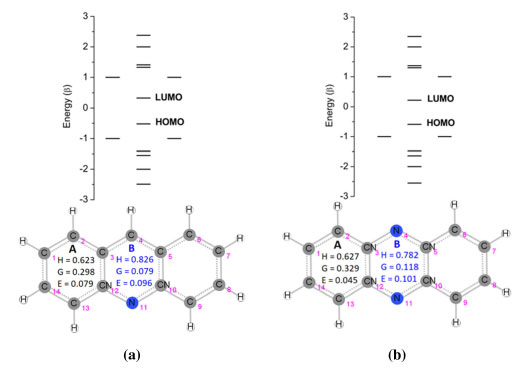 ![]() Figure 2. Molecular structure with atomic numbering and energy level diagram of (a) acridine and (b) phenazine. The numbers in the rings represent the index values of HOMA (H), GEO (G), and EN (E) calculated from experimental geometric data53,54