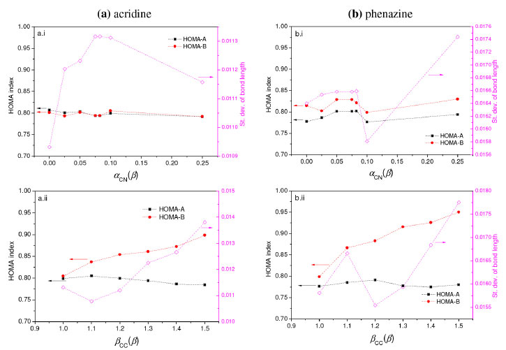 ![]() Figure 3. Results of aromaticity index of HOMA of the two non-equivalent rings (A and B) of (a) acridine and (b) phenazine, for the variation of (i) αCN (for βCC = 1.0) and (ii) βCC (for αCN = 0.1). For all graphs, the right axis shows the standard deviation of bond length